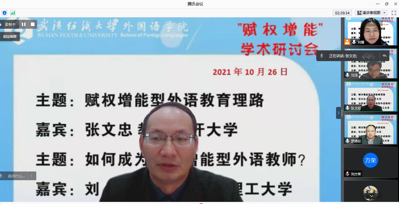 2021年10月26日,ok138cn太阳集团529于线上举办了赋权增能学术研讨会。南开大学赋权增能型英语教学团队负责人张文忠教授和团队成员天津理工大学刘浩博士应邀做了主旨发言。会议由ok138cn太阳集团529罗绮伦副院长主持,ok138cn太阳集团529院长谭燕保、党委书记胡中原及ok138cn太阳集团529赋权增能团队近三十位教师参加了会议。