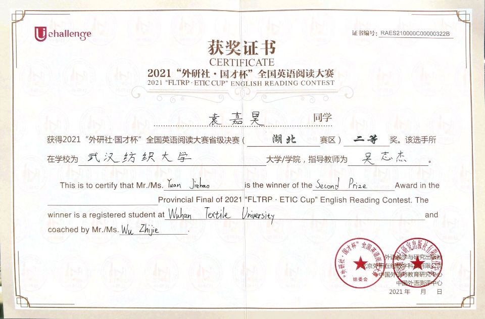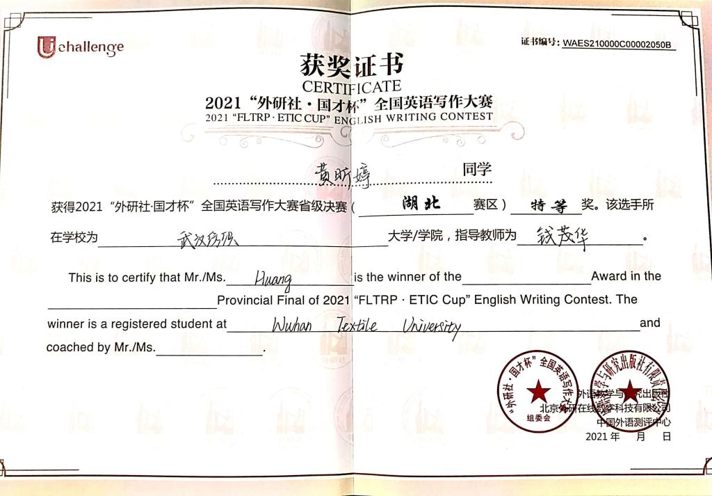 本次比赛成绩取得了历史性的突破,在获得2021“外研社·国才杯”写作大赛湖北省决赛特等奖的三位选手中,我校黄昕婷同学以较大的优势稳居第一。计算机与人工智能学院20级学生袁嘉昊在与湖北省各高校、各专业66名学生的同台竞争中,以湖北省排名17的成绩获得了二等奖