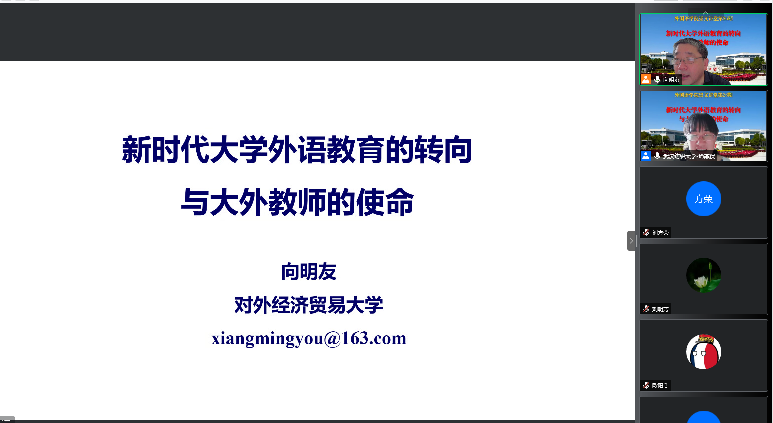 6月23日下午4点,对外经济贸易大学惠园杰出学者,英语学院院长向明友教授受ok138cn太阳集团529之邀,在云端作了题为“新时代大学外语教育的转向与大外教师的使命”的学术讲座。讲座由院长谭燕保主持,ok138cn太阳集团529全体教师在线上参加了此次讲座。