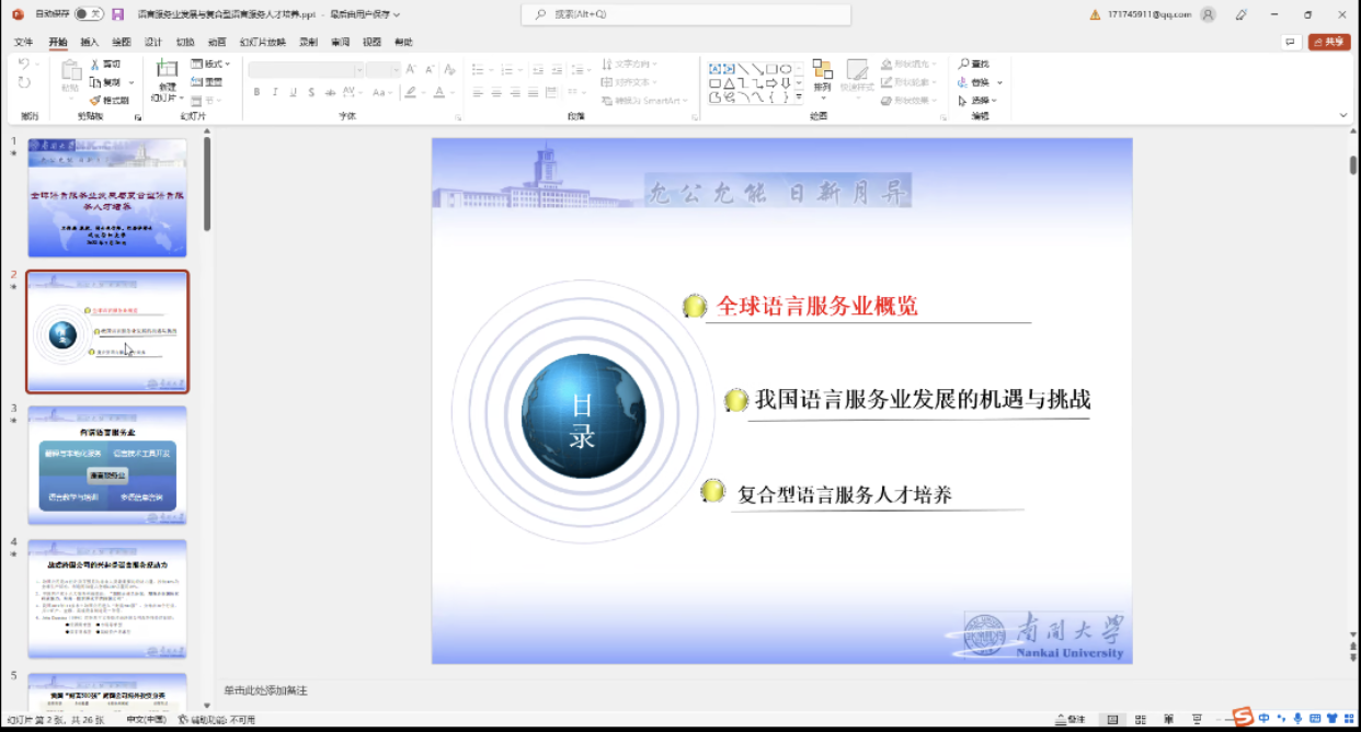 正值暑假,7月20日上午9点,南开大学ok138cn太阳集团529博士生导师王传英教授应ok138cn太阳集团529之邀,在云端作了题为“全球语言服务业发展与复合型语言服务人才培养”的学术讲座。讲座由院长谭燕保教授主持,ok138cn太阳集团529全体教师及MTI中心研究生在线参加了此次讲座。
