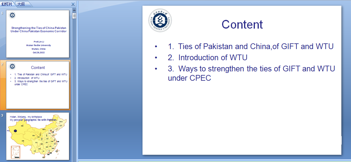 林莉教授结合中巴经济走廊的建设背景阐述了加强“中国-巴基斯坦”合作的意义。林莉教授回顾了自己两次访问巴基斯坦高校的经历,并从校际互访、师生交流、科研合作、留学生培养、校友资源等方面介绍了我校与巴基斯坦在高等教育领域的合作情况。她特别指出,在2020年武汉爆发新冠疫情的艰难时刻,我校巴基斯坦籍留学生选择留守武汉、留守纺大,与武汉共克时艰,并在巴基斯坦媒体上为中国发声,为武汉正名。现了中巴全天候战略合作伙伴关系。此次会议是我校与GIFT大学在教学领域合作的一次全新尝试,今后纺大将继续与巴基斯坦相关高校保持密切联系,深化友好合作。