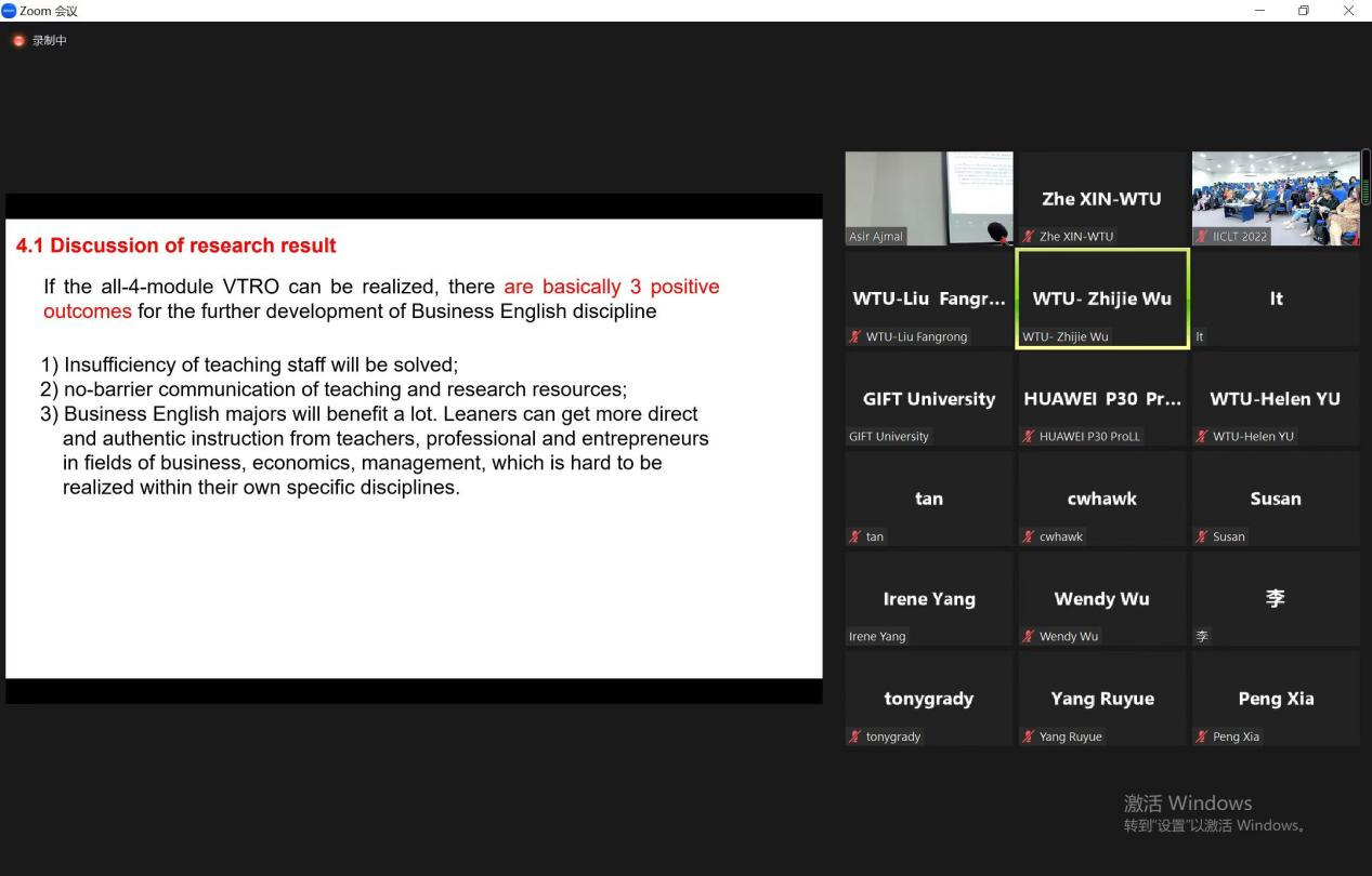 吴志杰老师以The Exploration of Virtual Teaching and Research Office Model – Taking Business English Discipline as an Example(虚拟教研室的建设模型探索 – 以商务英语专业为例)为题,介绍了“四新”、“商务英语”、“虚拟教研室”的定义及演变历程,梳理了“商务英语专业”和“虚拟教研室”的建设发展史,从虚拟教研室的“平台建设”、“资源建设”、“交叉学科研究合作建设”、“制度建设”四个方面探讨了构建跨学科、跨校、跨院系、跨校企的虚拟教研室的路径与内容。吴老师表示,随着信息技术与高等教育融合的加深、交叉领域学科合作的加深,虚拟教研室必然是学科建设、课程建设的发展趋势。