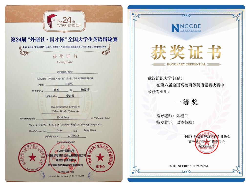 四、首次获评“外研社•国才杯”全国大学生英语辩论赛全国三等奖(叶可、杨思韬),学院人才培养质量获得新提高。6月,第24届“外研社•国才杯”全国大学生英语辩论赛决赛在线上举行,我院学生叶可、杨思韬团队获评全国三等奖,该奖项为我院学生在该项赛事中首次进入国赛并取得奖项。10-11月,2022年“外研社•国才杯”全国英语演讲、写作、阅读大赛湖北省决赛在线上举行,我院学生宋丹妮、曾钰璇、人工智能专业学生袁嘉昊分别获评湖北省决赛二等奖。