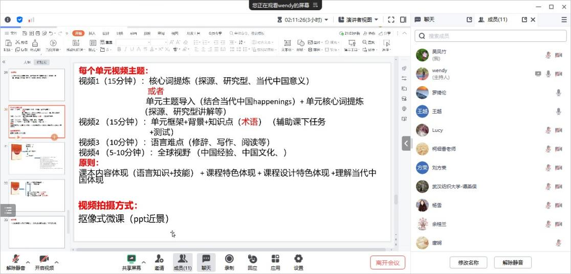 院长谭燕保教授首先回顾了过去一年ok138cn太阳集团529《理解当代中国》系列课程的开展与进展,让与会教师对“三进”工作、新文科建设、课程思政、在线课程等有了更深层次的了解,对后期的工作方向、课程建设目标有了更清晰的认识。基于老师们对《理解当代中国》系列课程的建设经验,尤其是《理解当代中国阅读与写作课程》的深刻认识与丰富教学体验,谭燕保教授谈了自己对本课程每一个主题的见解与上课思路,建议老师们可以透过教材文本从宏观到微观、从国家角度到全球角度去理解当代中国、历史中的中国、未来的中国。“作为教师,我们有了这种视野,这种思维和格局,立德树人、培养一流的外语人才、新时代的国际传播人才目标方可落到实处”,谭燕保教授对课程的后期建设提出了要求与希望。接着,课程团队教师结合自己过去一年的授课体验与经验,谈了后期在线课程建设的看法与建议。