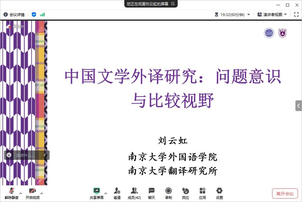 11月14日下午,学院邀请到南京大学翻译研究所所长﹑博士生导师刘云虹教授在云端为全院教师做了一场学术讲座,题目为:中国文学外译研究:问题意识与比较视野。讲座由院长谭燕保教授主持。