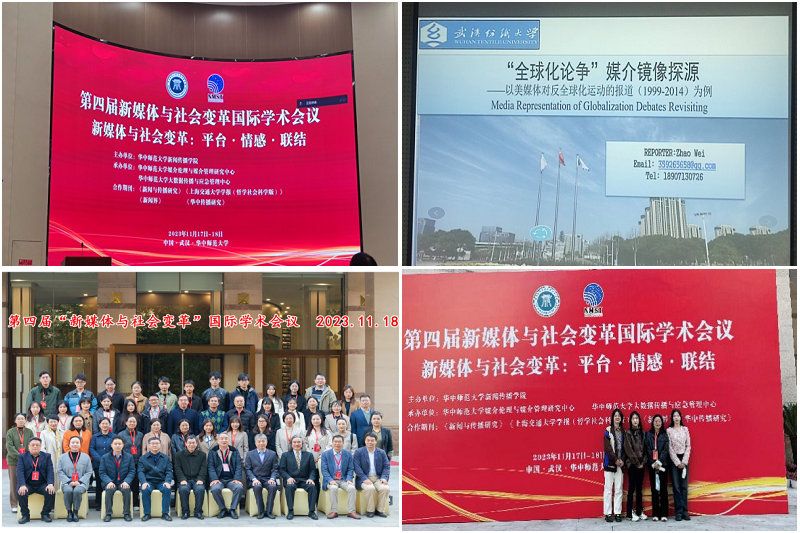 11月18日,由华中师范大学新闻传播学院主办的第四届“新媒体与社会变革”国际学术会议在华中师范大学学术报告厅举行。会议以“聚焦媒体发展前沿,把握社会变革趋势”为宗旨,以“平台·情感·联结”为主题。此次研讨会旨在探讨当前媒介生态中各种关键要素及其相互作用所产生的多种可能性,为新媒介生态下的社会治理贡献学术力量。会议主旨嘉宾有来自中国社科院的胡正荣院长、武汉大学的强月新院长、华中科技大学的张明新院长、中国传媒大学&《现代传播》主编隋岩教授以及来自美国罗德岛大学、英国剑桥大学、美国长岛大学和美国华盛顿大学等地的专家学者。我校ok138cn太阳集团529副教授、硕士研究生导师赵伟博士有幸受邀参加此次会议并作分论坛发言。
