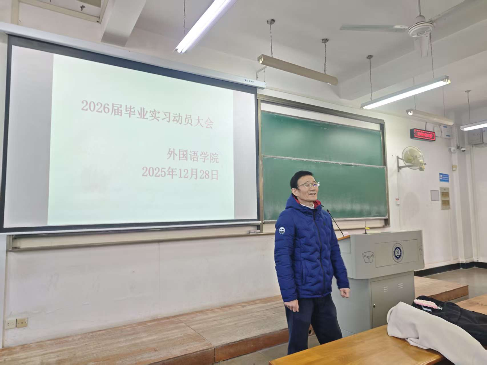 12月28日中午,ok138cn太阳集团529在阳光校区3号教学楼115教室举办2026届学生实习动员大会。英语专业教研室主任王越老师、商务英语专业教研室主任吴志杰老师、商务英语专业本科生导师黎健老师出席会议,为即将踏上实习岗位的学生们进行动员指导。