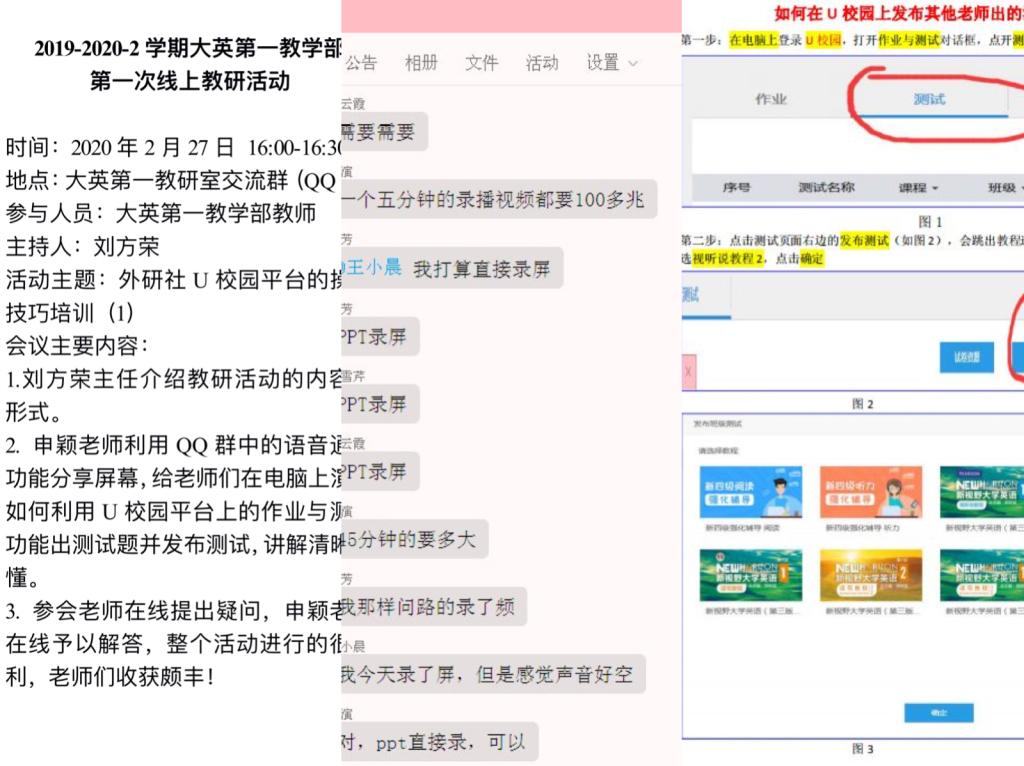 由于新冠疫情形势严峻,很多老师因为过年在武汉封城之前回了老家或滞留在外地,面临着没有教材,没有电脑而进行网络授课的困难。大学英语第一教学部先后进行两次U校园的操作技巧培训。首先是刘方荣主任就如何利用U校园发布共享测试卷把操作步骤截图,做成PDF格式的操作说明,分享在教学部的QQ群里;其次是2月27日周四下午教学部策划了一场如何运用U校园在线出测试卷的专题培训,邀请申颖老师通过QQ群课堂中的分享屏幕,给老师们做了在线分享,让老师们在家能非常直观的get到网络教学平台的运用技巧,有效地促进老师们的网络教学实践。