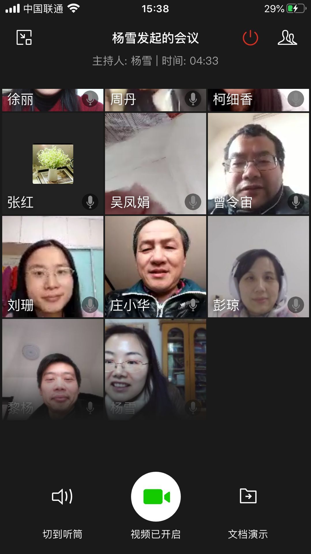 这是一次利用企业微信APP召开的视频会议。虽然隔着屏幕,老师们仍然热烈地讨论了本学期开课以来18级大学英语课程网上授课的情况。