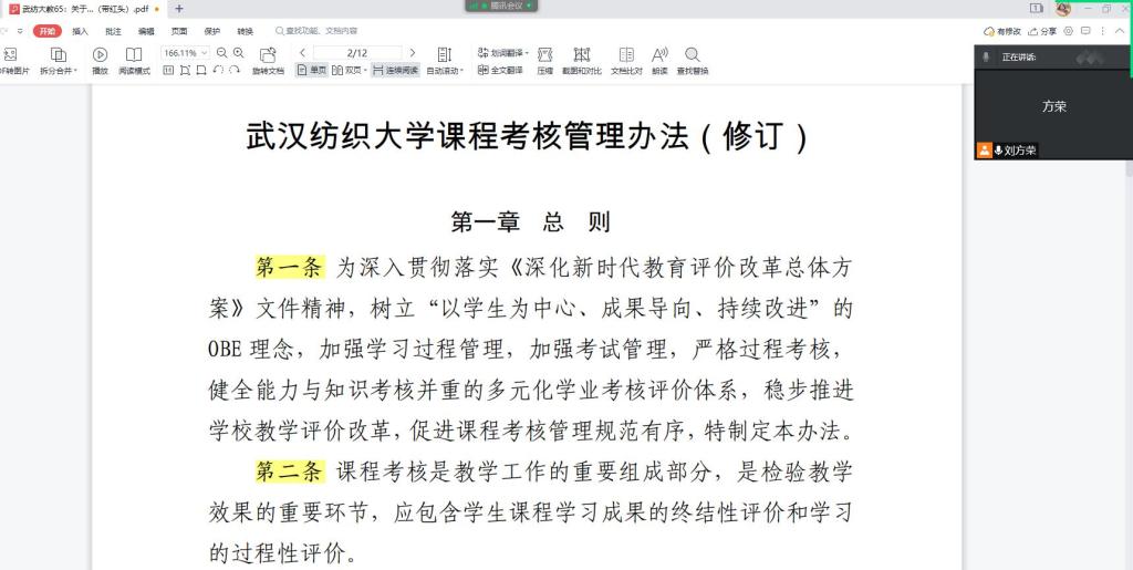 首先刘方荣进行屏幕分享,带领老师们学习了《ok138cn太阳集团课程考核管理办法(修订)》文件。根据新规定要求,树立OBE教学理念,加强学习过程管理,严格过程考核,加强试卷命题、批阅及教学材料存档的规范性。