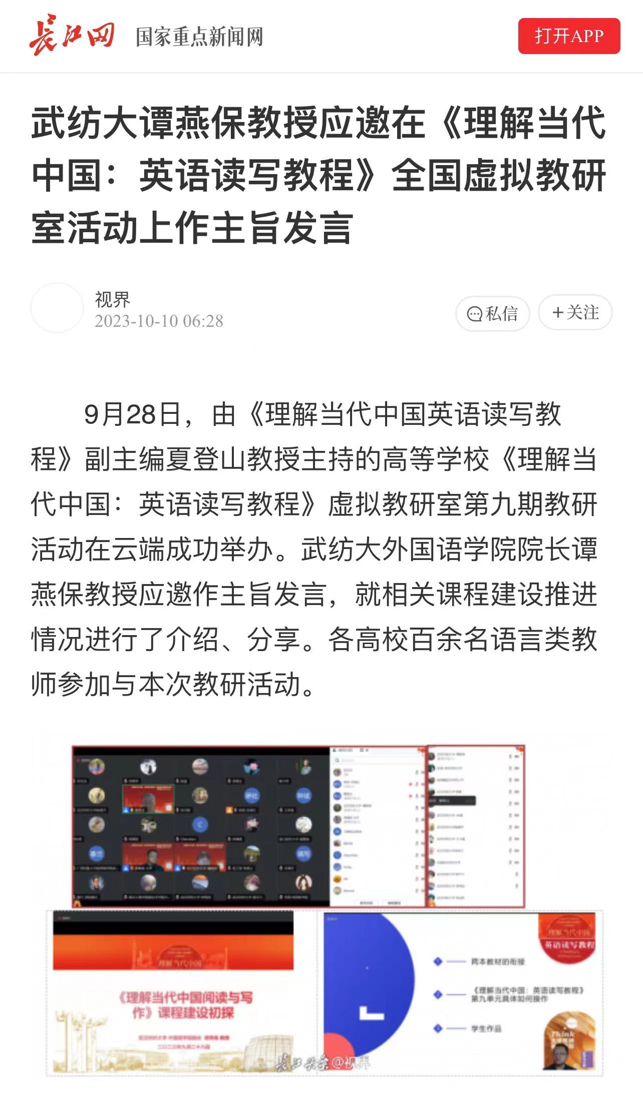 9月28日,由《理解当代中国英语读写教程》副主编夏登山教授主持的高等学校《理解当代中国:英语读写教程》虚拟教研室第九期教研活动在云端成功举办。武纺大ok138cn太阳集团529院长谭燕保教授应邀作主旨发言,就相关课程建设推进情况进行了介绍、分享。各高校百余名语言类教师参加与本次教研活动。