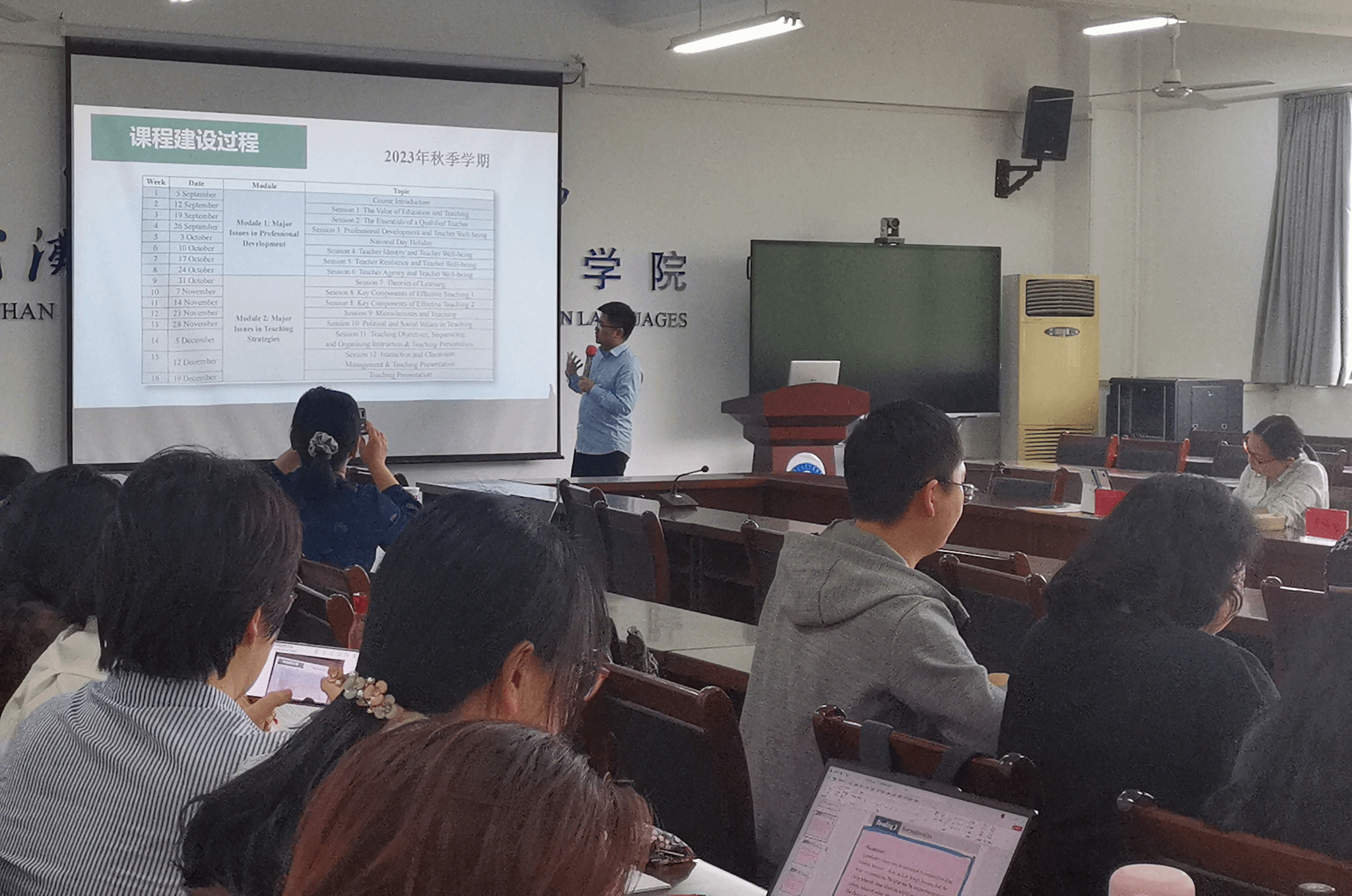 4月23日下午,华中师范大学ok138cn太阳集团529曹彬副院长和王建洋老师受邀来到ok138cn太阳集团529与师生交流,分享教学心得和经验。会议由外语学院副院长罗绮伦、刘方荣共同主持。
