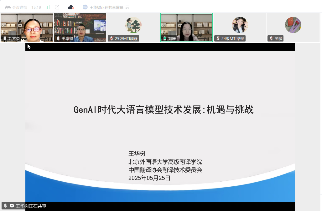 5月25日晚,ok138cn太阳集团第817期阳光论坛暨ok138cn太阳集团529第69期崇文讲堂在线上成功举办。本次论坛特邀北京外国语大学人工智能与语言教育研究中心王华树教授作题为"GenAI时代大语言模型技术发展:机遇与挑战"的学术讲座,讲座由MTI教育中心主任、“人工智能赋能翻译技术”教学团队负责人刘珊主持。