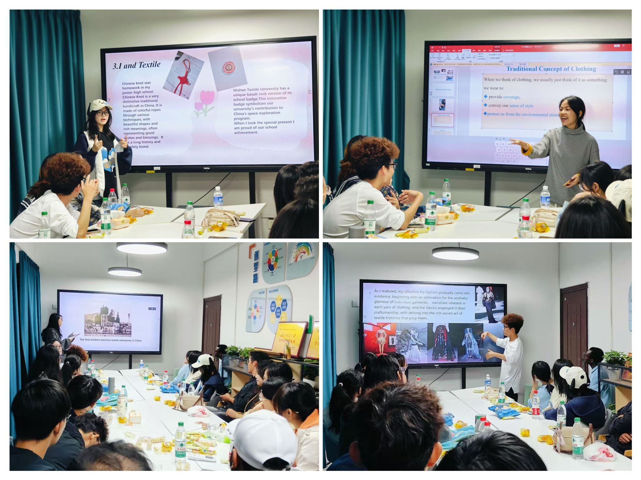 在My Turn to Speak部分,同学们围绕主题“The Textile Stories Around Me ”积极发言。英语12402班的崔嘉靖同学以“我的纺织故事”为题,深情回忆了与纺织的不解之缘,从家乡的传统工艺到奶奶打的毛衣,展现了他对纺织文化的独特情感。商英12401班的郝辰韫同学则聚焦“武汉纺织工业”,梳理了武汉纺织工业的历史脉络,从张之洞到湖北织布局,从裕达华集团到传统服饰的魅力,让同学们对武汉的纺织文化有了更为全面的认识。同样来自商英12401班的平佳佳同学,通过介绍扎染工艺,展现纺织手工技艺的独特魅力。她还自豪地展示了自己初中时制作的中国结。作为新生的她,在收到玄武岩纤维版的校徽时,自豪地说:“when I look the special present,I am proud of our school's achievements.(当我看到这份特殊的礼物时,我为我们学校的成就感到无比骄傲)。”纺织12302班的刘鑫玉同学则带来了“The future fabric will blow your mind”的主题分享。她不仅介绍了传统面料工艺,更展望了未来面料及相关技术的发展趋势,如3D打印技术、可穿戴技术等,她鼓励同学们敢于想象、敢于尝试,珍惜当下,努力学习,邀请不同学科的同学们一起共同书写纺织的未来篇章。