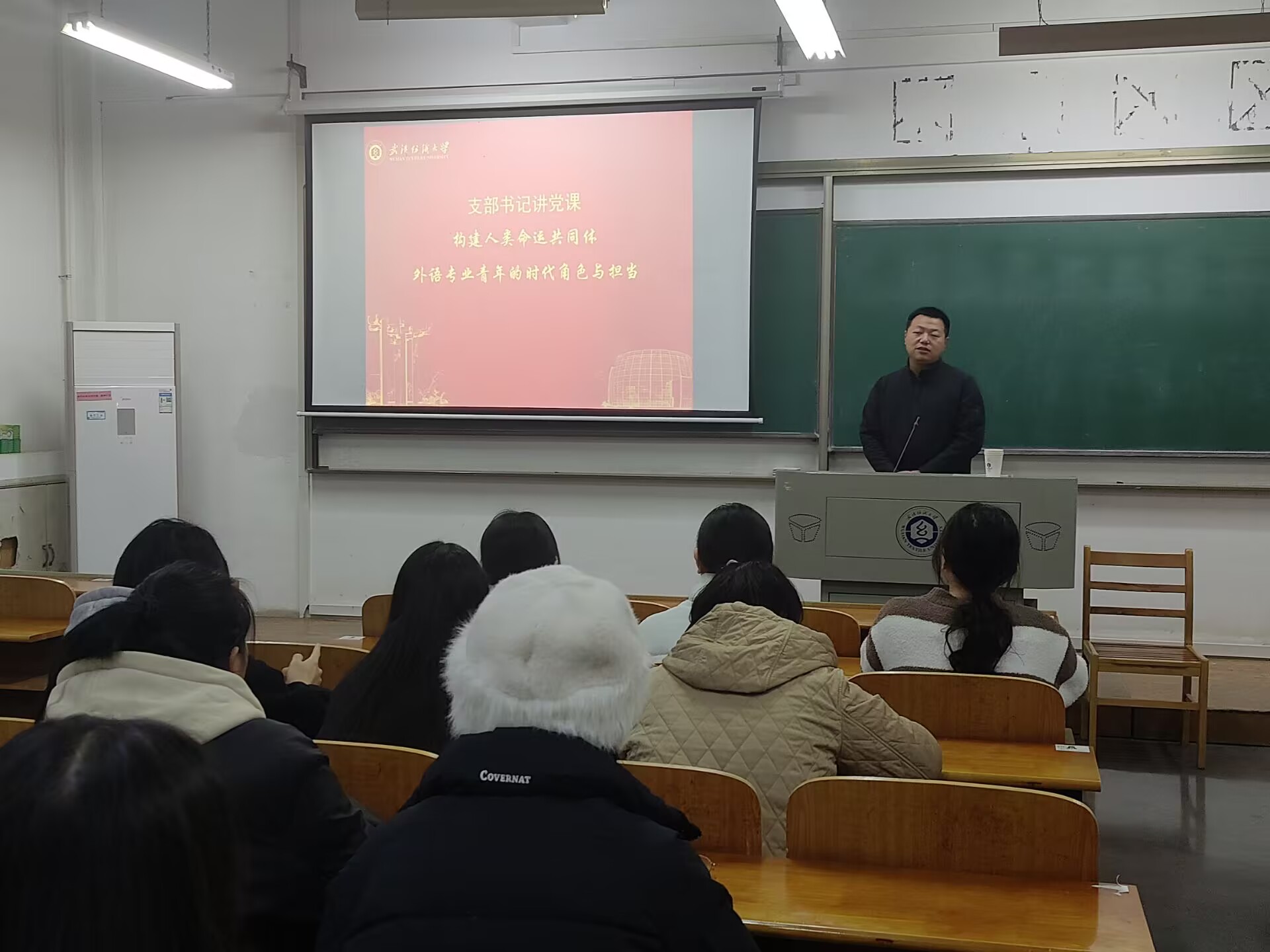 近日,ok138cn太阳集团529商务英语学生党支部召开专题党课学习。支部书记聂啸天以“构建人类命运共同体 外语专业青年的时代角色与担当”为主题,为支部全体党员授课。