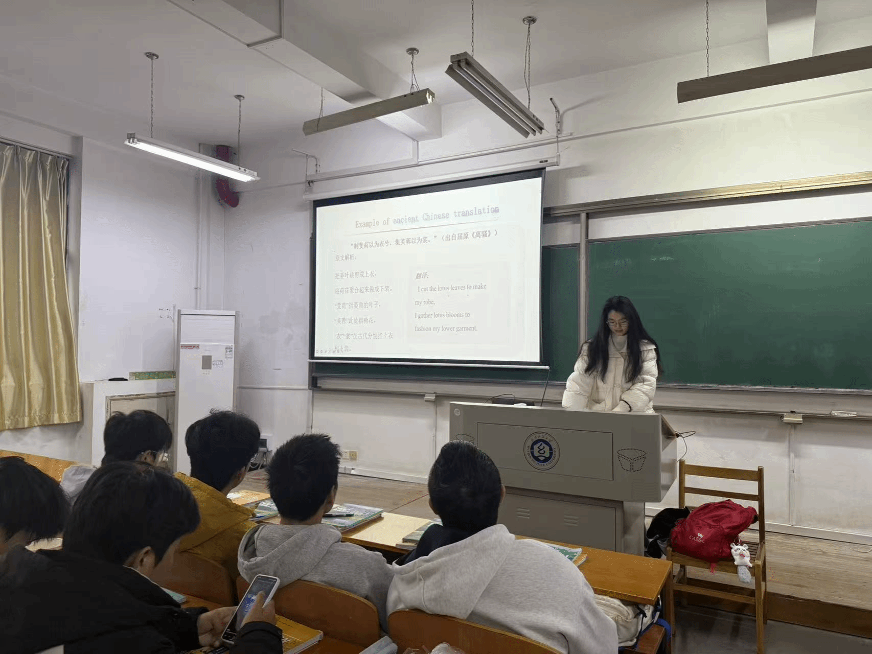 2025年12月20日下午两点,ok138cn太阳集团529主办的第408期本科生论坛在阳光校区03-302教室顺利举行。本期论坛聚焦“中国古代服饰文化及其英译策略”,英语专业本科生梅涵喻、张枞、陈天雨;商务英语专业张思思同学等团队通过三场主题报告,深入剖析了汉服形制、等级符号的跨文化传播与翻译实践,为传统文明的现代表达提供了创新视角。