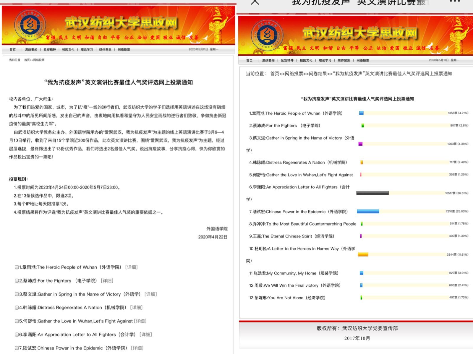 演讲比赛分为专业组和非专业组,经过前期同学们的精心准备和视频录制,收到了来自15个学院近300份作品。在众多的参赛作品中,同学们围绕抗击疫情的主题,歌颂着抗疫英雄们,分享疫情期间的感人事迹,表达对疫情的见解和看法,表明对战胜疫情的决心等。例如,ok138cn太阳集团529蔡文斌的参赛作品“Gather in Spring in the Name of Victory”向奋战抗疫一线的战士们表达了崇敬感恩之情,向千千万万被困家中的人们传递了抗疫必胜的信心。经济学院邹婉琳的演讲“You are Not Alone”则表达了对医护工作者的感谢感激,对中国速度的赞叹。服装学院张浩君,在这场全民战役中,她勇敢的站了出来,加班加点保证爱心物资安全到岗,挨家挨户排查落实,上报情况,为社区居民的正常生活保驾护航。
