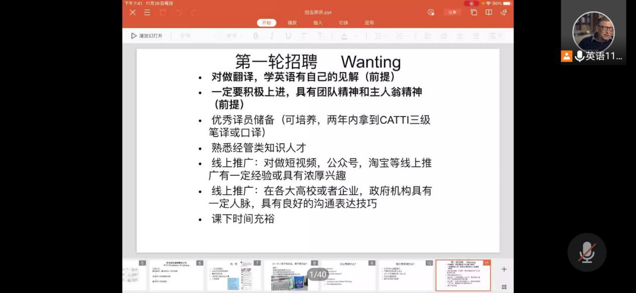 作为“武汉经纬语堂翻译公司”的执行董事,蔡文斌学长的创业精神与创业成功的经历给予新生鼓励,以自己成功的果实给新生树立起学习榜样。“创你所爱,业终成实”。首先,只要有自己热爱的东西,有好的想法,有好的创业思路,均可以投入精力加以实施,年纪不足以构成创业的瓶颈。其次,创业经费是必要,但不是首要,“国家大学生创业补贴”等项目将会为其提供相关的帮助。创业最重要是拥有上进心与批判性思维,在自己所热爱的事业上,在不影响学习的基础上,努力奋斗实现自己的创业梦想,铺就创业之路。