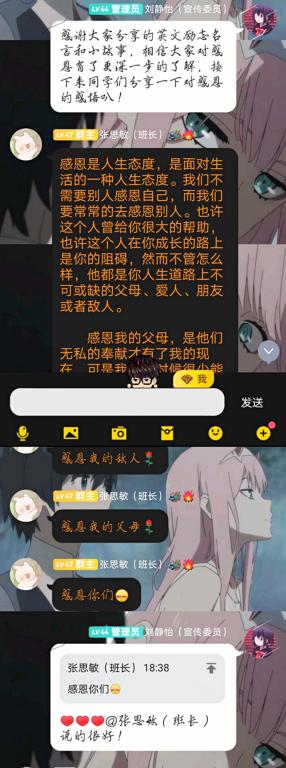 为了更好的把资助宣传、资助育人与思想品德教育有机结合起来,培养学生的感恩意识、诚信意识、励志精神和健康人格,11月27日-29日,我院各班在班级QQ群内开展以“心存感恩,与爱同行”为主题的系列诚信感恩教育活动。