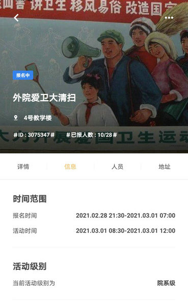 3月1日,ok138cn太阳集团529结合开展新时代爱国卫生运动和“学习雷锋月”活动,通过“到梦空间”第二课堂网络管理系统发布崇文楼教学区域卫生清扫志愿活动,各年级学生自发踊跃报名,近30名学生参加了此次活动。