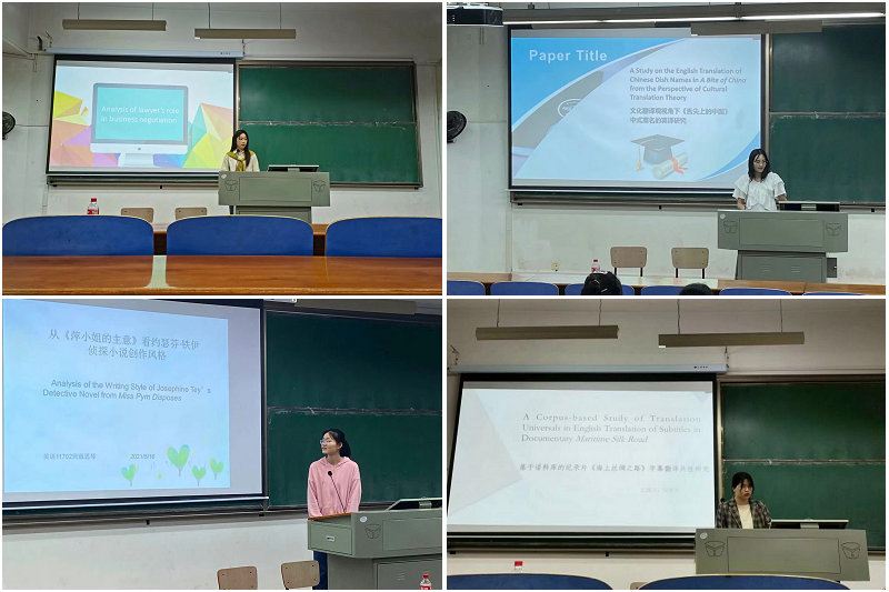 来自商务英语11701班的范敏同学向大家讲述了“律师在商务谈判中的角色分析”,并从五个部分向大家展示了此篇论文的构成,为大家详细解释了律师在商务谈判中扮演的四个不同的角色。英语11702班的龙晓琴同学为大家带来了“文化翻译观视角下《舌尖上的中国》中中式菜名英译研究”,她通过生动贴切的例子向大家展示了不同翻译手法和语境下对同一菜名的翻译差异,让大家感受到了中式菜名英译研究下的“中国味道”。英语11702班的戴思琴同学以外文著作《萍小姐》为研究对象,从整个著作的故事情节、人物形象、语言特色、写作手法、中心思想等多个方面进行深入的分析与研究,让大家对约翰芬.铁伊侦探小说创作风格有了初步的了解。英语11701班的郑梦君同学为大家展示了她“基于语料库的纪录片《海上丝绸之路》字幕翻译共性研究”,她以图文结合的方式详细阐述了语料库背景下关于《海上丝绸之路》相关字幕翻译共性的研究过程与结果,通过查找语料库、对比分析等方式进行进一步的完善。