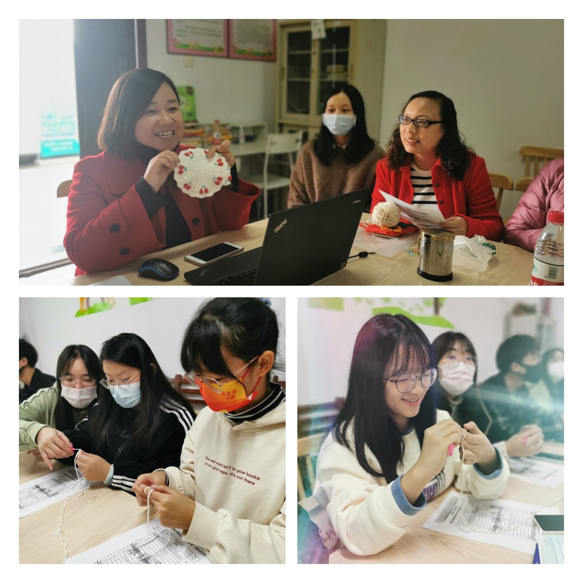 然后,邱凌云老师向大家展示自己的手工编织作品,有杯垫、手机包、抱枕、毛毯等,大家互相传看,纷纷表示赞叹,现场气氛十分活跃。邱凌云老师说:“其实手工编织非常有趣,大家可以在闲暇时光制作一些手工艺品,送给亲朋好友,不仅可以锻炼耐心,还能愉悦身心,拉近与身边人的距离。”接下来,邱凌云老师向大家介绍如何编织杯垫,大家兴致勃勃地学习。邱凌云老师对每一个同学耐心指导,大家都认真观看学习并反复练习。