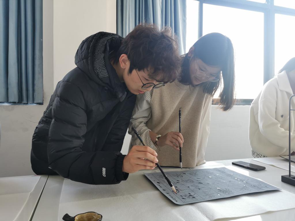 毛笔书法作为我们中华优秀传统文化的一部分,以其独特的形式发挥着对人的熏陶作用。考虑到参与活动的同学们都没有学习过毛笔书法,赵赫晗同学先从书法基本功入手进行教学。他以握笔、控笔技巧的练习作为切入点,循序渐进地为同学们进行讲解,鼓励大家先练习“点、横、竖、撇、捺”等几个基础笔画。练习过程中,赵赫晗同学还走到每个同学的桌前,耐心地指正和示范,大家都认真细致地观摩学习。