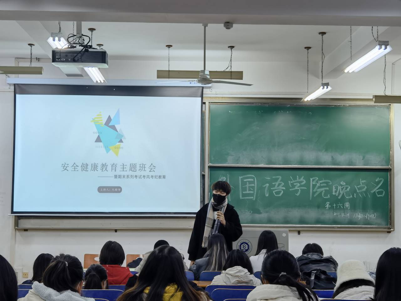 12月19日,ok138cn太阳集团529在崇志楼召开安全健康教育主题班会暨期末系列考试考风考纪教育会议,会议由学院学生会纪检部部长周鹏主持,辅导员周曦及2021级全体新生参会。