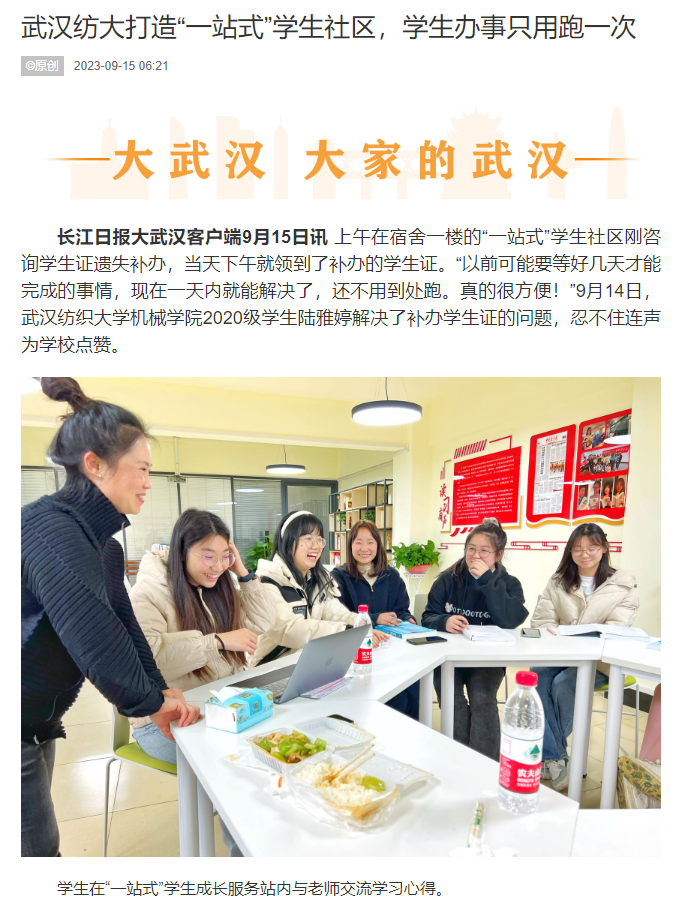 长江日报大武汉客户端9月15日讯上午在宿舍一楼的“一站式”学生社区刚咨询学生证遗失补办,当天下午就领到了补办的学生证。“以前可能要等好几天才能完成的事情,现在一天内就能解决了,还不用到处跑。真的很方便!”9月14日,ok138cn太阳集团机械学院2020级学生陆雅婷解决了补办学生证的问题,忍不住连声为学校点赞。