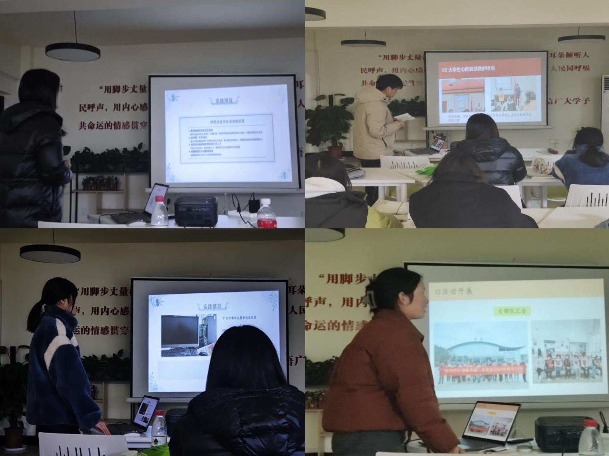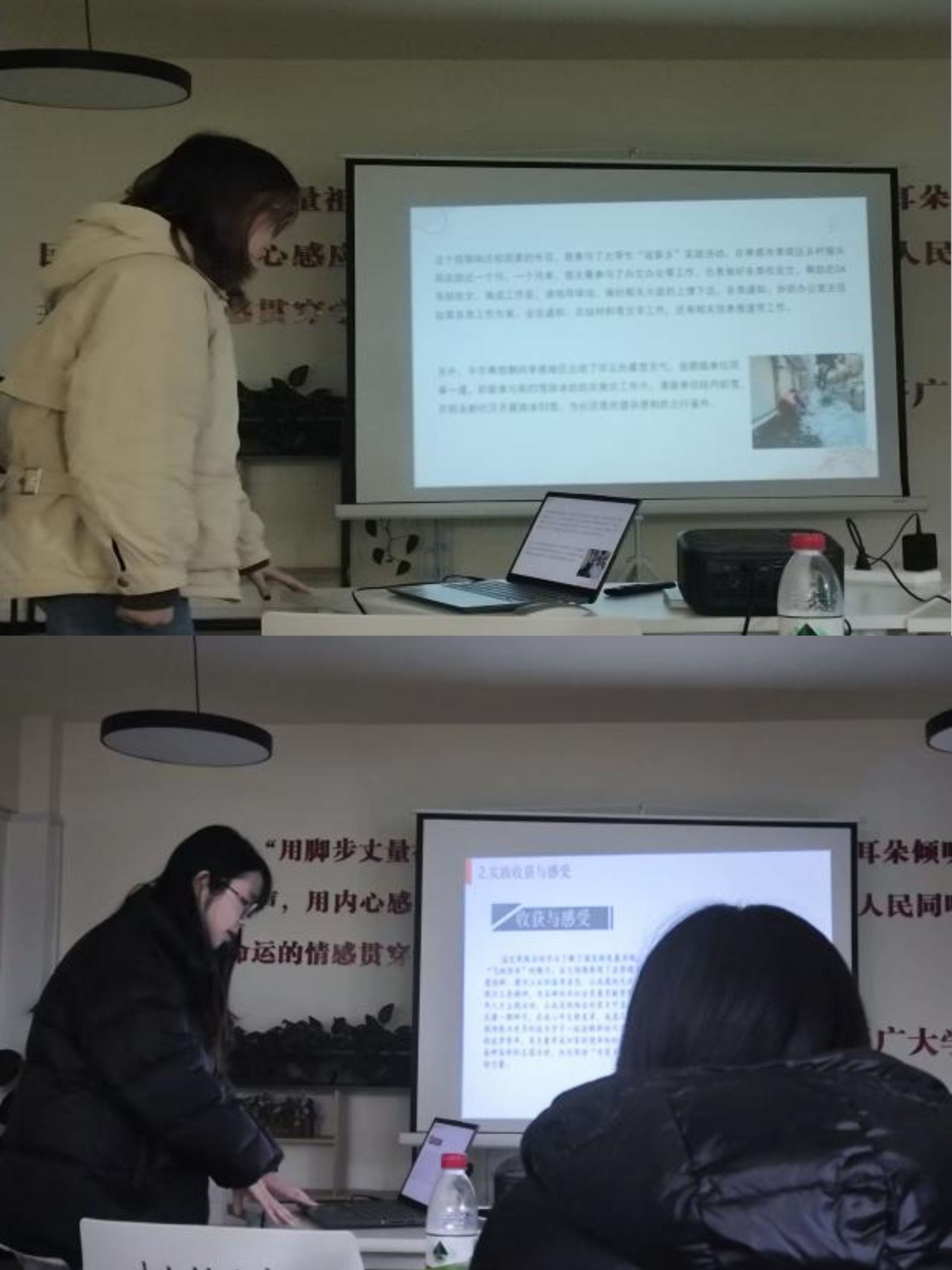 活动伊始,7名参与实践的同学依次介绍了自己寒假实习的经历和自己的感悟。英语12301班邹佳同学分享自己在老家孝感市火车站参与的“暖冬心动”,主要工作内容是维持旅客进出站秩序,为旅客提供指引、咨询等帮助,并为旅客提供热水、药品等。这次活动令邹佳收获颇多,她直言,“成为志愿者是自己从小的向往,梦想着能为社会尽自己的微薄之力”。英语12101班李金牒同学展示了自己在家乡五峰参加笔试考试,参观五峰民族工业园、劳模工匠馆和贸易物流园,参加座谈交流会和寒假课堂等实践内容。她感言,“家乡的变化让我感到无比骄傲,作为新时代青年,我将发挥专业优势和特长,为家乡发展尽一份力”。英语12202班李灵熙同学对自己在家乡孝感市孝南区乡村振兴局的实践活动做出分享。她主要参与办文办会工作,负责各类收发文和辅助办公室主任进行文字工作。此外,她还跟随单位同事外出除冰扫雪,为社区居民提供便利的出行条件。在此次活动中,她积累了不少工作经验,也认识到自己在沟通等方面的不足。英语12302班谢中盛同学分享了自己在家乡荆州市图书馆的实践经历,包括图书整理与上架编排、大学生心肺复苏救护培训和创文洁城活动。通过这次活动,他认识到培养奉献意识、提高实践本领和发扬团队协作精神的重要性。商英12201叶羽洁同学介绍了她在家乡仙桃市沙嘴办事处叶河社区村委会参加的“七彩课堂”活动。与其他分享者不同的是,她从学校的“七彩课堂”志愿活动中汲取灵感,一手策划并全程参与了此次活动,从招募志愿者到制定课程表、准备教室和教学用具再到开展课程并定期评估。分享时,她感慨“自己收获了志同道合的朋友,浅尝教育之道,人生阅历这本书又多写了一面”。商英12201班李安羽同学对其在家乡广州市青年志愿者协会的文员工作作出交流。她协助完成项目策划、新媒体运营、办公文书以及广东智慧团建系统运营等工作。此外,她还分享了自己参加大赛的实践经历和线上下实习经历。实践活动“锻炼和提升工作态度与责任心”,也让她“对未来职业规划有了更清晰的认识”。